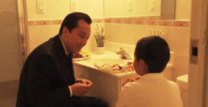Mũi chủ nhân thấy cay cay, miệng đắng chua, mắt chợt thấy ướt, ngấn lệ, không cần hỏi thêm nữa, ông đã hiểu rõ tất cả! Ông lặng lẽ quay về bàn tiệc nói với tất cả các vị khách: “Xin lỗi các vị, hôm nay tôi không thể tiếp tục cùng các vị ăn bữa tối nữa, tôi phải tiếp một vị khách đặc biệt!”. Sau đấy, ông lấy hai đĩa thức ăn trên bàn tiệc. Đến toa-lét, ông lịch sự gõ cửa. Sau khi được cậu bé cho phép, ông bước vào, đặt hai đĩa lên trên nắp bồn cầu. Ông nói: “Gian phòng đẹp đẽ như thế này, đương nhiên không thể để cháu một mình hưởng thụ được, chúng ta sẽ cùng nhau ăn tối với mhau!”.