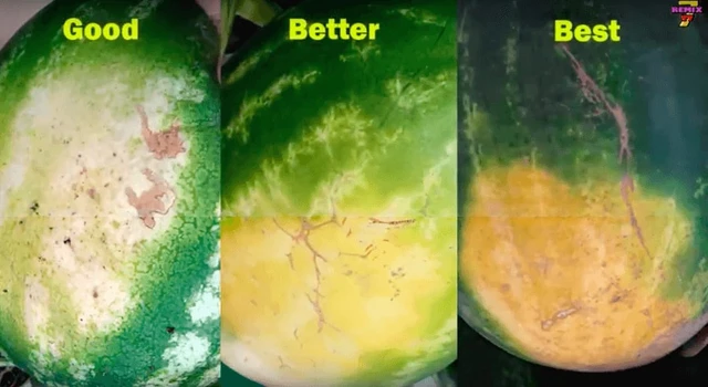 Đầu tiên người dùng có thể nhìn vào phần đáy của quả dưa hấu, cụ thể là màu sắc ở phần này. Đáy dưa hấu thường tiếp xúc nhiều với mặt đất, thường mang màu vàng. Vì vậy nếu chúng mang màu vàng hoặc vàng hơi cam, thậm chí ngả nâu, tức là đây là quả dưa ngon, có bị ngọt sắc. Còn nếu màu trắng, nhạt màu hơn thì quả dưa đó sẽ không ngon bằng.