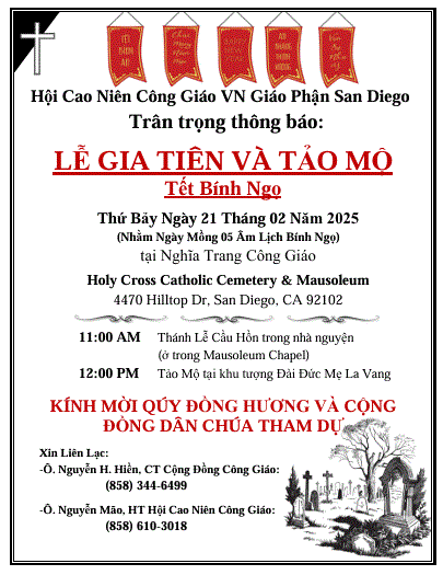 Hội cao Niên Công Giáo VN Giáo Phân San Diego – Trân trọng thông báo :Lễ Gia Tiên Và Tảo Mộ – Tết Bính Ngọ -Ngày Thứ Bảy 21-2-2026 February 4, 2026 TNT SD Quảng Cáo, Sinh Hoạt Cộng Đồng