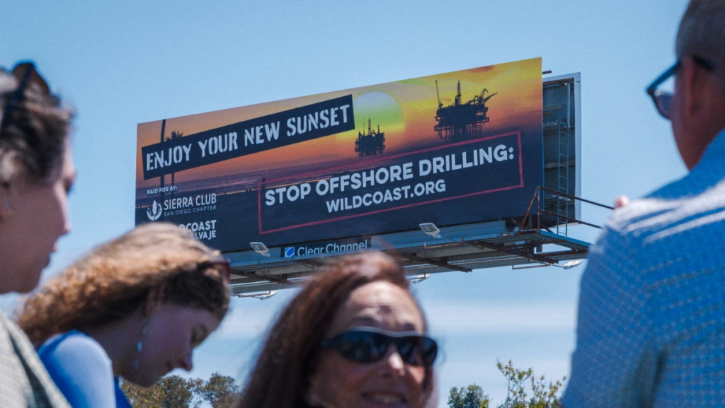 .Hôm thứ Sáu, một liên minh gồm các nhóm bảo vệ môi trường và các quan chức dân cử đã hợp lực để phát động một chiến dịch mới chống lại hoạt động khoan dầu ngoài khơi.WILDCOAST và Chi hội San Diego của Sierra Club đã cùng với Thượng nghị sĩ tiểu bang Catherine Blakespear, D-38, Hạ nghị sĩ Hoa Kỳ Mike Levin, D-49, và Ủy viên Hội đồng Quận 1 Thành phố San Diego Joe LaCava — tất cả đều đại diện cho các cộng đồng ven biển — khánh thành một bảng quảng cáo ở Clairemont Mesa.Bức ảnh cho thấy các giàn khoan dầu trên đường chân trời phía bãi biển lúc hoàng hôn với thông điệp: “Hãy tận hưởng hoàng hôn mới của bạn. Hãy ngừng khoan dầu ngoài khơi.”